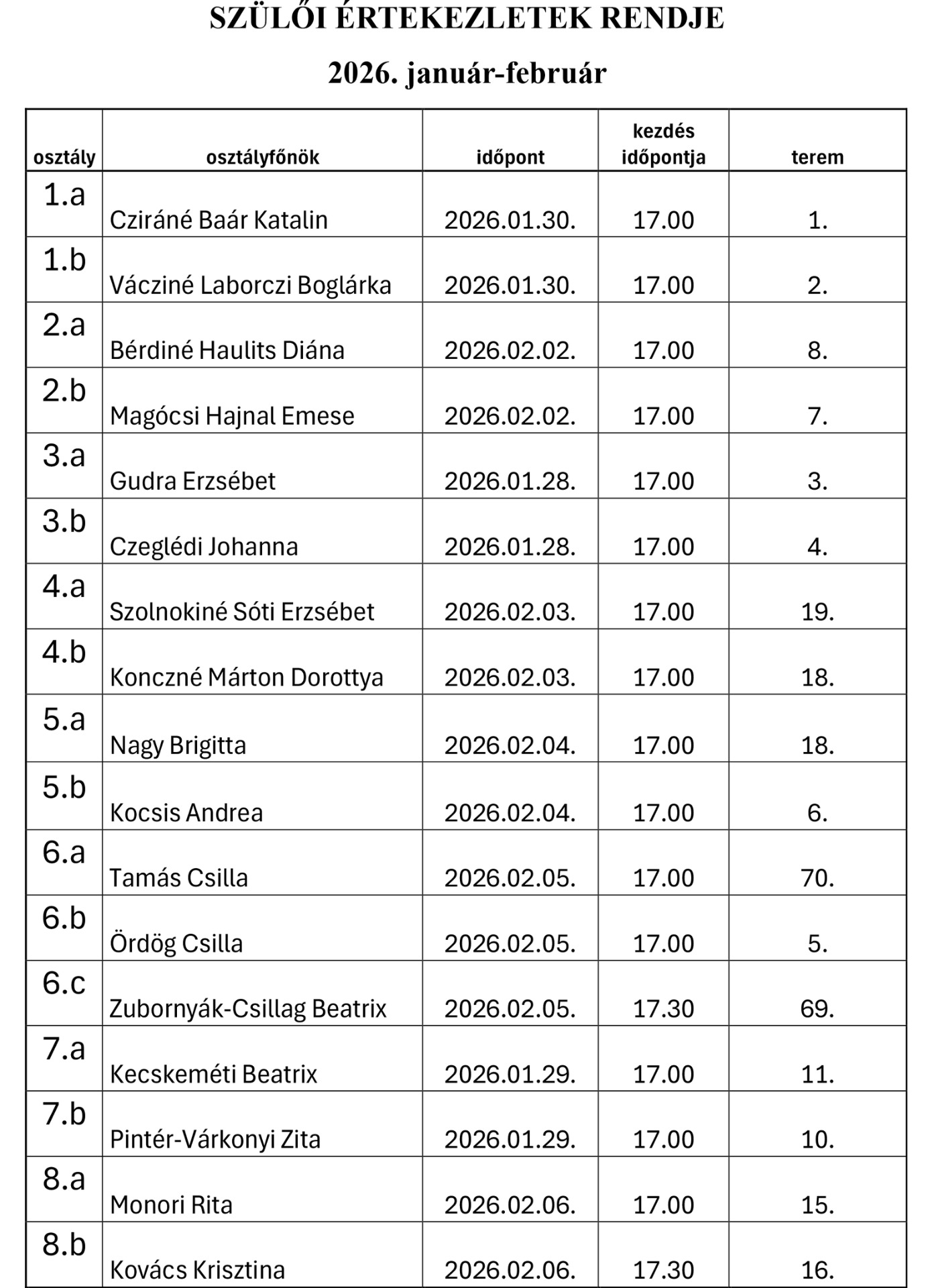 Szülői értekezletek rendje